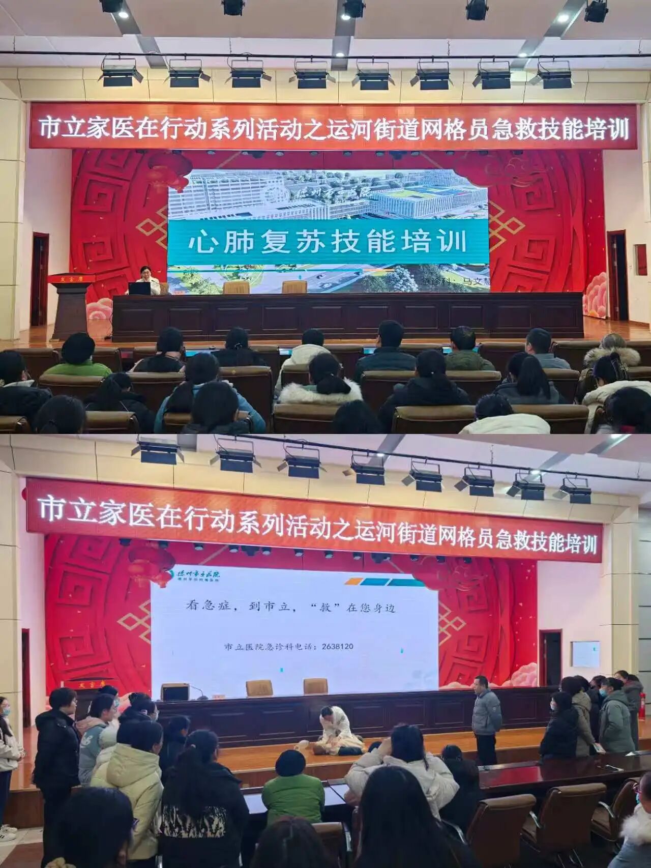 为提升基层网格员的应急救护能力,更好地保障辖区居民生命健康安全,2026年1月6日下午,应运河街道办事处及运河卫生院邀请,德州市立医院公卫科组织急诊科马文慧主任为50余名运河街道办事处网格员进行了急救技能培训。本次培训在运河办事处礼堂举行,培训内容聚焦心肺复苏的标准操作及海姆立克急救方式的正确运用,马文慧主任通过理论讲解与实操演示相结合的方式,深入浅出地传授了关键要领与注意事项,旨在提升街道网格员的应急急救知识及能力,从而更好地服务于辖区居民。